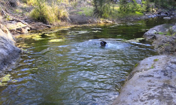 by 1400 to as it will take us about 20 minutes to make our way to the road.So we head back to the swimming hole we found on the next bend. Telashi enjoys the water more than our other mutts, but they are all getting wet today. Guess it’s due to the heat as it’s very warm today. We cross the water several times to see things on the other side and we stick to the water course as we head further upstream, but even so we aren’t all that far from camp.